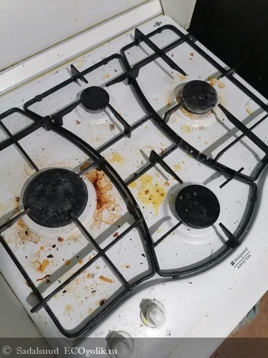 Картина печальная. Но я была настроена разобраться с этим по-быстрому. Я распылила средство, растерла его обычной губкой. Особенно никаких сил не прилагала, просто равномерное разнесла по всему периметру плиты. Далее промыла губку, чтобы средство его не разъело, и оставила минут на 5. Потом начала удалять и средство и растворившуюся грязь.