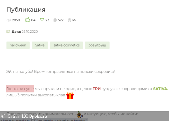 В каждом сундуке право на покупку косметики SATIVA в интернет-магазине Ecoville.ru на 3 000руб.