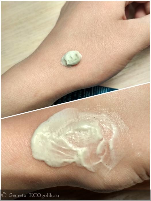 Маска кремовой текстуры, цвет у неё бледно-зелёный, она неоднородна, можно увидеть небольшие вкрапления более тёмного цвета.