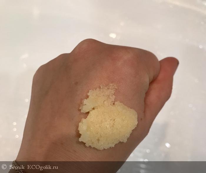 Аромат скраба для тела приятный и совсем ненавязчивый. В нем есть нотки кокоса и сухого молока. После применения к сожалению на коже тела не улавливается.