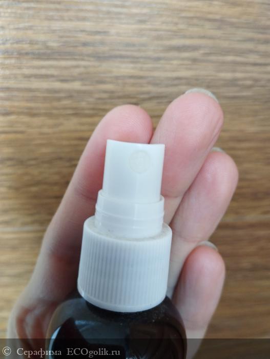 Распылитель работает исправно и выдает мелкое облачко средства, которое равномерно ложится на лицо. На самом флаконе есть этикетка со всей необходимой информацией от производителя: состав, способ применения и срок годности.