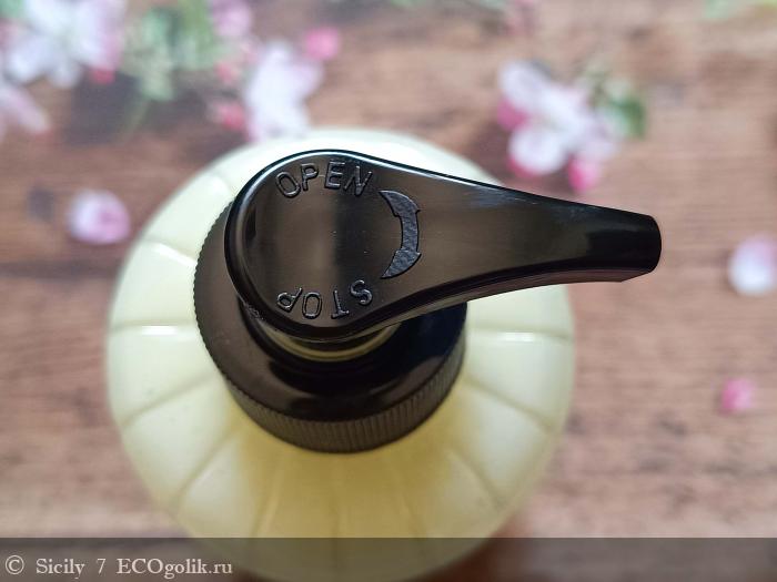 Флакон оснащен дозатором-помпой с поворотным механизмом.