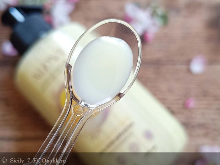 По текстуре и цвету гель похож на молочко светло-жёлтого цвета с приятным ароматом спелых бананов, напоминающий молочный коктейль. После душа запах еще какое-то время держится на теле, но звучит ненавязчиво.