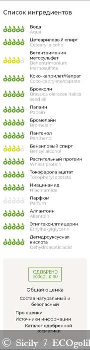 Aqua (вода дистиллированная), Cetearyl alcohol (цетилстеариловый спирт), Behentrimonium Methosulfate (бегентримониум метосульфат), Coco-caprylate/caprate (коко-каприлат/капрат), Brassica oleracea italica seed oil (масло брокколи), Papain (папаин), Bromelain (бромелайн), Panthenol (Д-пантенол), Benzyl alcohol (бензиловый спирт), Wheat protein (пшеничный протеин), Tocopheryl acetate (витамин Е), Niacinamide (ниацинамид), Parfum (отдушка), Allantoin (аллантоин), Ethylhexylglycerin (этилгексилглицерин), Dehydroacetic acid (дегидроуксусная кислота).