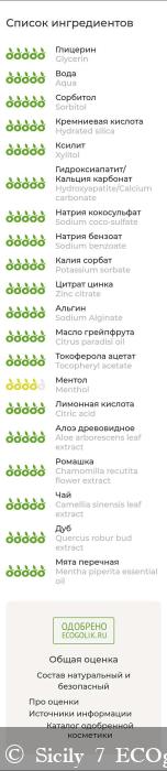 Glycerin (глицерин растительный), Aqua (вода дистиллированная), Sorbitol (сорбитол), Hydrated silica (диоксид кремния), Xylitol (ксилит), Hydroxyapatite/Calcium carbonate (гидроксиапатит/карбонат кальция), Sodium coco-sulfate (кокосульфат натрия), Sodium benzoate (бензоат натрия), Potassium sorbate (сорбат калия), Zinc citrate (цитрат цинка), Sodium Alginate (альгинат натрия), Citrus paradisi oil (эфирное масло грейпфрута), Tocopheryl аcetate (витамин Е), Menthol (ментол), Citric acid (лимонная кислота), Aloe arborescens leaf extract (экстракт алоэ вера), Chamomilla recutita flower extract (экстракт ромашки), Camellia sinensis leaf extract (экстракт зеленого чая), Quercus robur bud extract (экстракт дуба), Mentha piperita leaf extract (экстракт мяты), Mentha piperita essential oil (эфирное масло мяты).