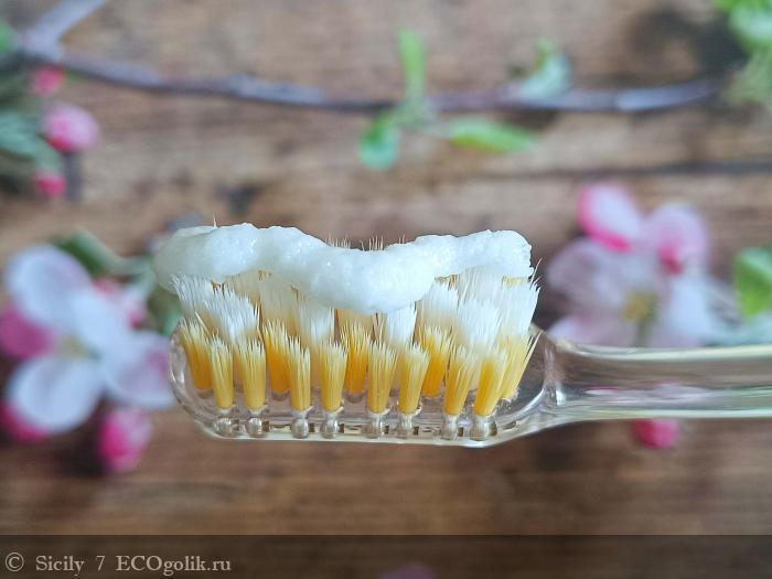 Паста хорошо распределяется по зубам и умеренно пенится. Сверхпены не дает, но на качество чистки зубов это никак не влияет.