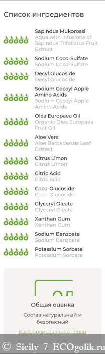Aqua with infusions of Sapindus Trifoliatus Fruit Extract (индийский мыльный орех), Sodium Coco-Sulfate (ПАВ на основе кокосового масла), Decyl Glucoside (безопасный ПАВ на основе кокоса и кукурузного крахмала), Sodium Cocoyl Apple Amino Acids (яблочный ПАВ), Organic Olea Europaea Fruit Oil (органическое масло оливы), Organic Aloe Barbadensis Leaf Extract (органический экстракт алоэ-вера), Citrus Limon Fruit Juice (лимонный сок), Citric Acid (лимонная кислота), Coco-Glucoside (безопасный кондиционирующий компонент и ПАВ на основе кокоса), Glyceryl Oleate (безопасный кондиционирующий компонент на основе оливкового масла), Xanthan Gum (натуральный полисахарид), Sodium Benzoate (пищевой консервант из ягод брусники), Potassium Sorbate (пищевой консервант из ягод рябины)