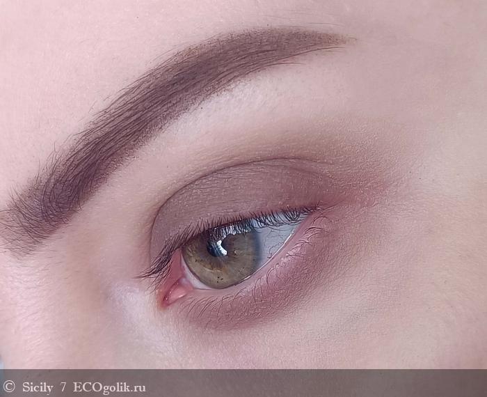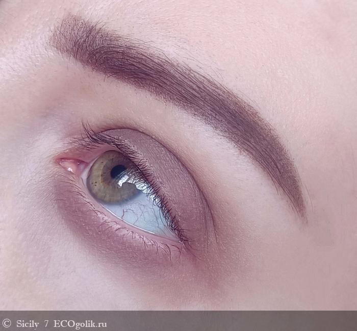 В течение дня тени держатся хорошо, не осыпаются и не плывут. Они отлично заполняют просветы между волосками и визуально делают брови гуще, придавая им естественный вид. Брови выглядят очень аккуратно и красиво.
