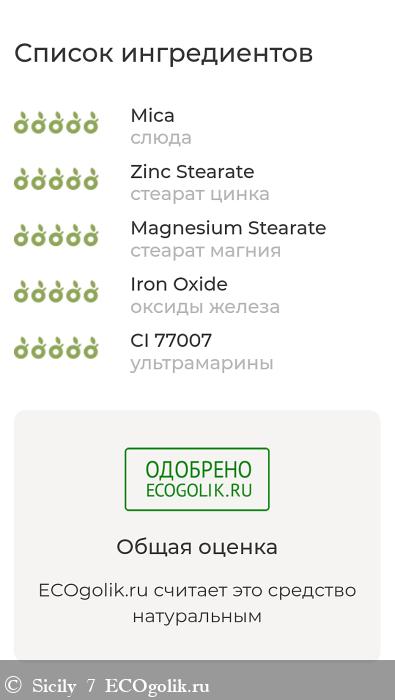 слюда (Mica CI 77019), стеарат цинка (Zinc Stearate), стеарат магния (Magnesium Stearate), оксиды железа (Iron Oxide CI 77491, CI 77492, CI 77499), ультрамарины (Ultramarine Blue CI 77007)