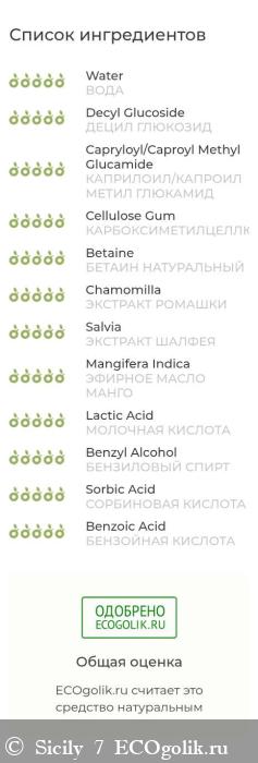 ВОДА, ДЕЦИЛ ГЛЮКОЗИД, КАПРИЛОИЛ/КАПРОИЛ МЕТИЛ ГЛЮКАМИД, КАРБОКСИМЕТИЛЦЕЛЛЮЛОЗА, БЕТАИН НАТУРАЛЬНЫЙ, ЭКСТРАКТ РОМАШКИ, ЭКСТРАКТ ШАЛФЕЯ, ЭФИРНОЕ МАСЛО МАНГО, МОЛОЧНАЯ КИСЛОТА, БЕНЗИЛОВЫЙ СПИРТ, СОРБИНОВАЯ КИСЛОТА, БЕНЗОЙНАЯ КИСЛОТА.