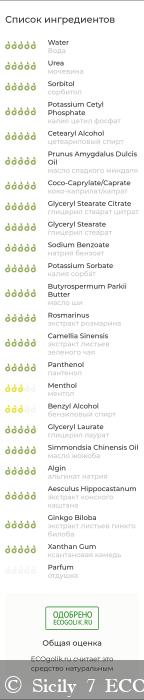 Вода, мочевина, сорбитол, коко-каприлат, калия цетил фосфат, цетеариловый спирт, масло сладкого миндаля, коко-каприлат/капрат, глицерил стеарат цитрат, глицерил стеарат, натрия бензоат, калия сорбат, масло ши, экстракт розмарина, экстракт листьев зеленого чая, пантенол, ментол, бензиловый спирт, глицерил лаурат, масло жожоба, альгинат натрия, экстракт конского каштана, экстракт листьев гинкго билоба, ксантановая камедь, отдушка.