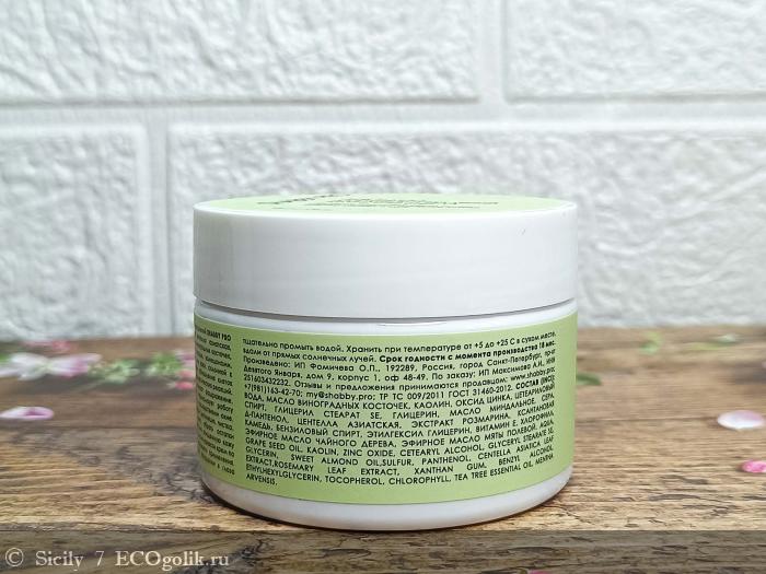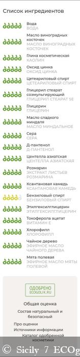 ВОДА, МАСЛО ВИНОГРАДНЫХ КОСТОЧЕК, КАОЛИН, ОКСИД ЦИНКА, ЦЕТЕАРИЛОВЫЙ СПИРТ, ГЛИЦЕРИЛ СТЕАРАТ SE, ГЛИЦЕРИН, МАСЛО МИНДАЛЬНОЕ, СЕРА, Д-ПАНТЕНОЛ, ЦЕНТЕЛЛА АЗИАТСКАЯ, ЭКСТРАКТ ЛИСТЬЕВ РОЗМАРИНА, КСАНТАНОВАЯ КАМЕДЬ, БЕНЗИЛОВЫЙ СПИРТ, ЭТИЛГЕКСИЛГЛИЦЕРИН, ВИТАМИН Е, ХЛОРОФИЛЛ, ЭФИРНОЕ МАСЛО ЧАЙНОГО ДЕРЕВА, ЭФИРНОЕ МАСЛО МЯТЫ ПОЛЕВОЙ