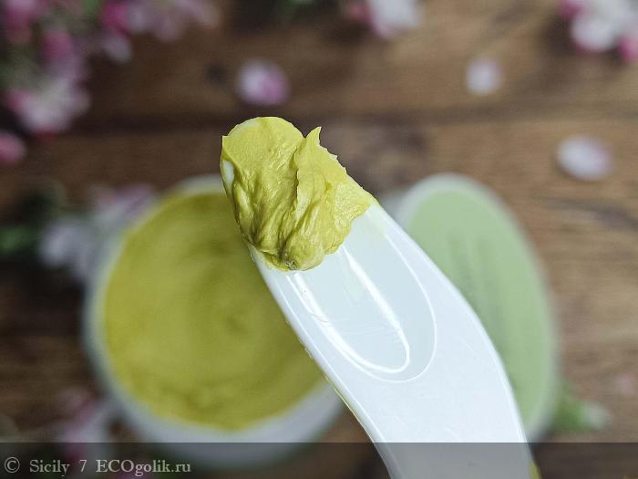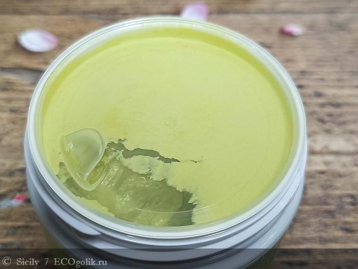 Маска помещена в лаконичную баночку нежно-зеленого цвета, оттенок которой напоминает о свежести и природных компонентах, входящих в ее состав.