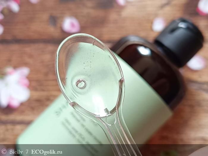 Шампунь имеет довольно жидкую прозрачную консистенцию, с приятным свеже-цитрусовым ароматом, который не остается на волосах.