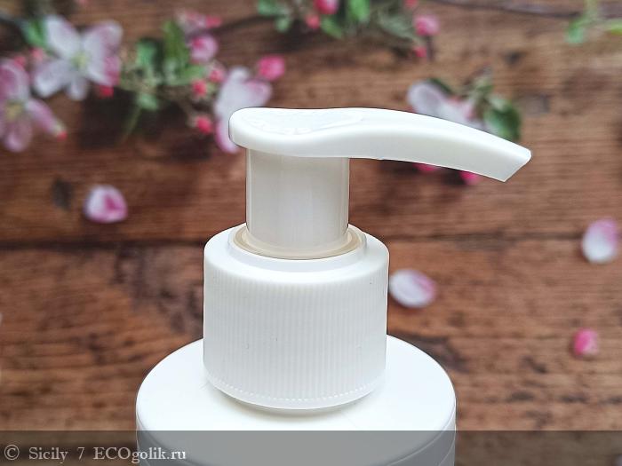 Флакон оснащен дозатором помпового типа, с поворотным механизмом.
