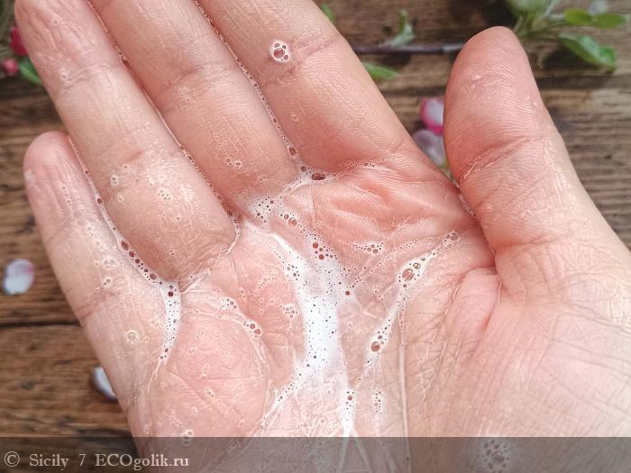 Он легко пенится, но без фанатизма, то есть не образует огромную шапку пены, как некоторые аналогичные гели. Для меня это плюс, потому что смывать приходится меньше, а ощущение чистоты остается.