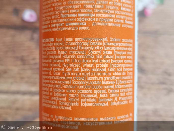 Aqua (вода дистиллированная), Sodium cocosulfate* (кокосульфат натрия), Cocamidopropyl betaine (кокамидопропилбетаин), Sodium cocoyl isethionate (изетионат натрия), Coco-glucoside (кокоглюкозид), Glycerin (глицерин), Niacinamide (витамин PP), Betaine (бетаин), Sea salt (соль морская), Dicaprylyl ether (дикаприлиловый эфир), Decyl glucoside (децил глюкозид), Glyceryl oleate (глицерил олеат), Polymnia sonchifolia root extract (экстракт якона), Urtica dioica leaf extract (экстракт крапивы), Hydrolyzed wheat protein (гидролизованный пшеничный протеин), Citric acid (лимонная кислота), Guar hydroxypropyltrimonium chloride (гуар гидроксипропилтримониум хлорид), Jasminum grandiflorum essential oil (эфирное масло жасмина), Tocopheryl acetate (витамин Е), Benzyl alcohol (бензиловый спирт), Potassium sorbate (сорбат калия), Aniba rosaeodora essential oil (эфирное масло розового дерева), Eugenia caryophyllata essential oil (эфирное масло гвоздики), Rosa canina fruit extract (экстракт шиповника), Retinyl palmitate (витамин А), Phospholipids (фосфолипиды), Sphingolipids (сфинголипиды), Dehydroacetic acid (дегидроуксусная кислота). *является мягким ПАВ, получаемым из кокосового масла, не является опасным SLS, разрешён международным стандартам ECOCERT.