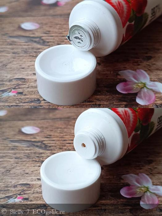 Дизайн тубы яркий и привлекательный, с акцентом в виде сочных ягод клубники.