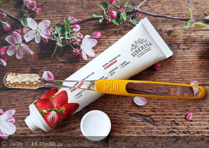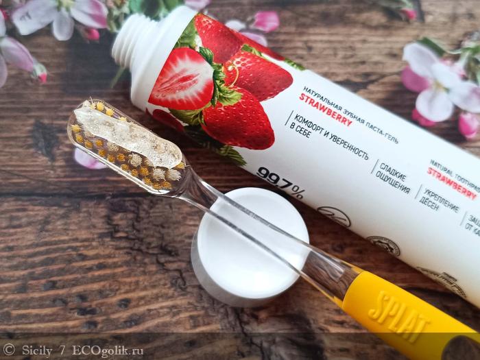 Паста хорошо очищает поверхность зубов от налета. Зубы после чистки гладкие и чистые. Она оставляет после себя приятный, слегка клубничный привкус. Не приторный, не навязчивый. Просто лёгкую мятную свежесть с намеком на лето.