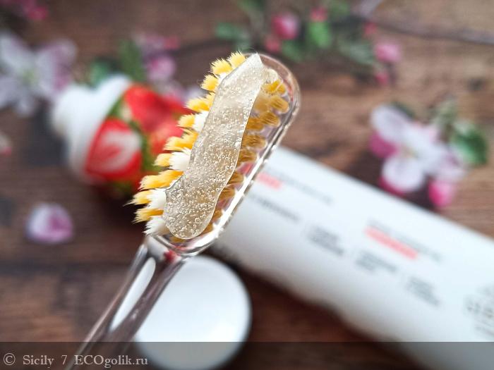 Консистенция у пасты гелевая, прозрачная, без каких-либо абразивных частиц и вкраплений.