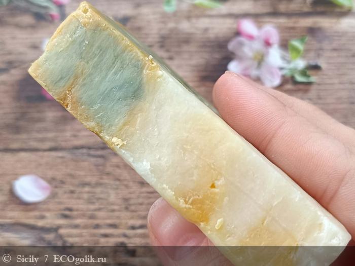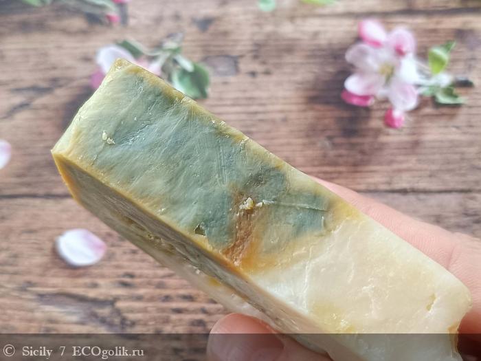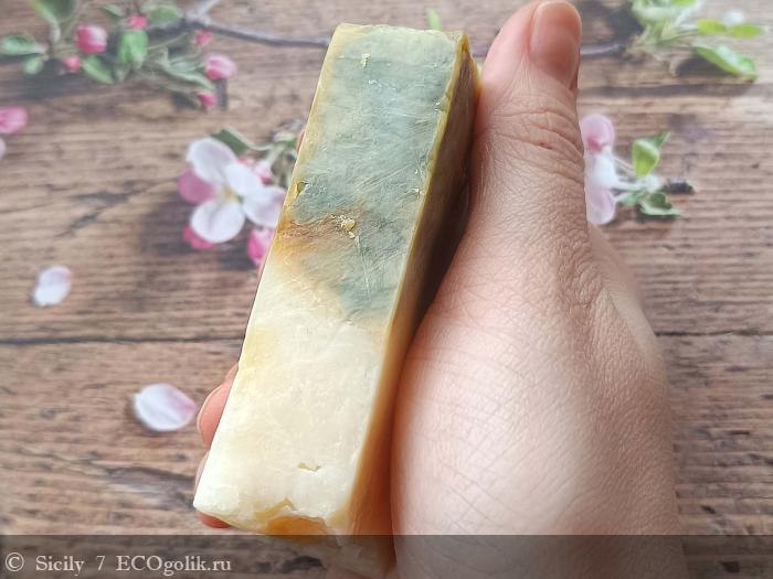 Выглядит брусок очень эстетично. Этакий мраморный узор из зеленых и жёлтых разводов. Сразу видно, что ручная работа, сделано с душой.