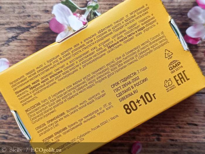 Palm oil (натриевые соли жирных кислот пальмового масла), Olive oil (оливкового масла), Coconut oil (кокосового масла), Aqua (вода дистиллированная), Glycerin (глицерин растительный), Hippophae rhamnoides oil (масло облепиховое), Citrus aurantium dulcis peel essential oil (эфирное масло апельсина), Abies alba essential oil (эфирное масло пихты), Cedarwood siberian essential oil (эфирное масло кедра), Propylene glycol (пропилен гликоль), Chlorophyllin (хлорофилл), Curcumin (куркумин).