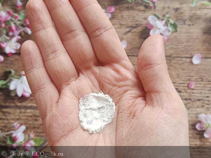Сама пудра представляет собой мелкодисперсный белый порошок без крупных абразивных частиц с приятным цитрусовым ароматом.