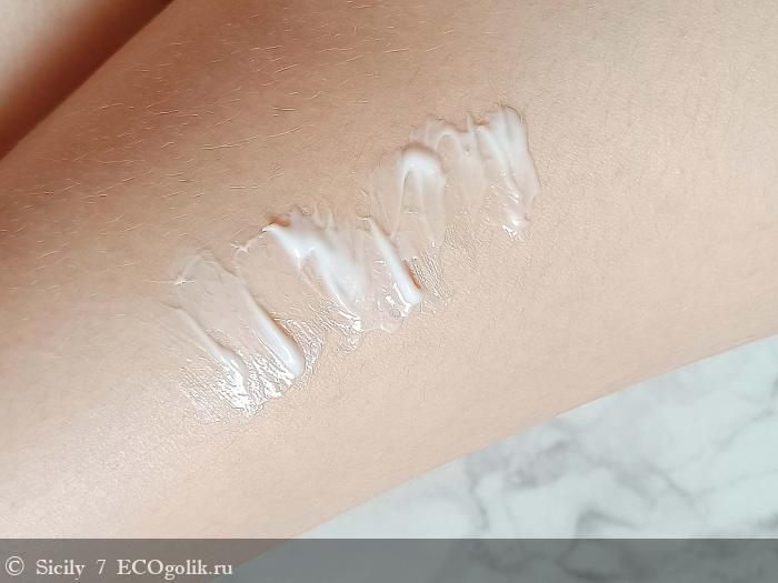 По ощущениям слегка маслянистый, нечто среднее между кремом и молочком для тела.