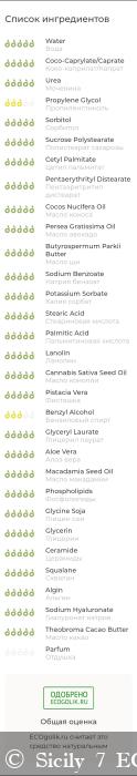 Вода, Коко-каприлат/Капрат, Мочевина, Пропиленгликоль, Сорбитол, Полистеарат сахарозы, Цетиловый пальминат, Пентаэритритил дистеарат, Масло кокоса, Масло авокадо, Масло ши, Натрия бензоат, Калия сорбат, Стеариновая кислота, Пальмитиновая кислота, Ланолин, Масло конопли, Масло фисташки, Бензиловый спирт, Глицерил лаурат, Алое вера, Масло макадамии, Фосфолипиды, Глицин сои, Глицерин, Церамиды, Сквалан, Альгин, Гиалуронат натрия, Масло какао, Отдушка.