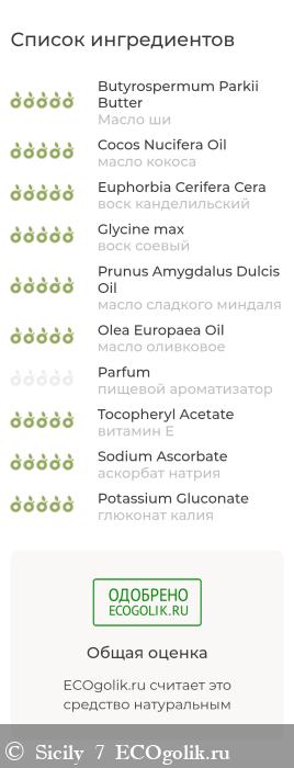 Масло ши, масло кокоса, воск канделильский, воск соевый, масло сладкого миндаля, масло оливковое, пищевой ароматизатор, витамин Е, аскорбат натрия, глюконат калия.