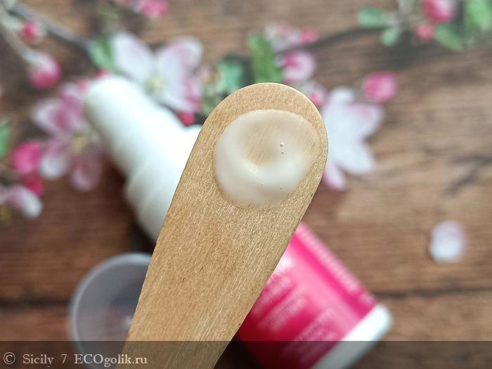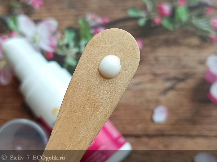 Крем обладает нежной флюидной текстурой белого цвета.