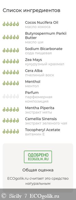 масло кокоса, масло ши, сода пищевая, кукурузный крахмал, пчелиный воск, ментол, парфюмерная композиция, экстракт мяты, экстракт зеленого чая, витамин Е.