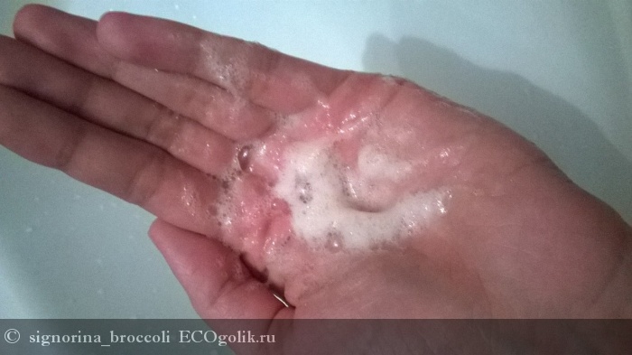 По консистенции шампунь напоминает кисель со слегка розоватым оттенком. Порадовало, что, шампунь оказался не таким жидким как я ожидала, и сквозь пальцы не убегал