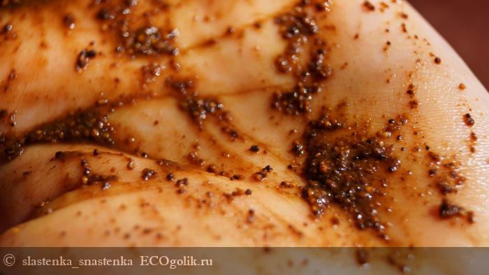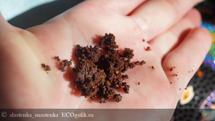 В первый раз я применила продукт по привычке, как обычные скрабы и чуть не испачкала полотенце, когда стала вытираться, так как на теле остались небольшие кофейные разводы.