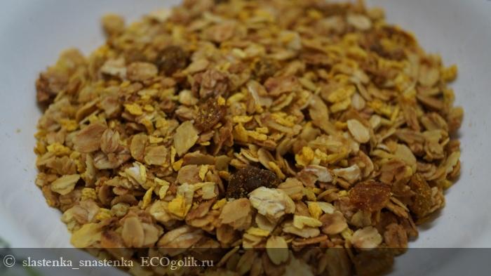 В основе продукта - цельнозерновые овсяные хлопья, натуральный мёд, кокосовая стружка, куркума, изюм и эфирное масло апельсина.