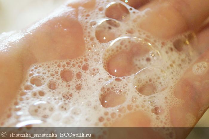 При взаимодействии с водой, хорошо пенится и приятно обволакивает кожу при принятии душа.