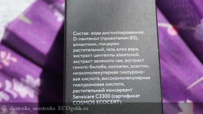 Вода дистиллированная, D-пантенол (Провитамин В5), аллантоин, глицерин растительный, гель алоэ вера, экстракт центеллы азиатской, экстракт зеленого чая, экстракт гинкго-билоба, коллаген, эластин, низкомолекулярная гиалуроновая кислота, высокомолекулярная гиалуроновая кислота, растительный консервант Sensicare C3300 (сертификат COSMOS ECOCERT).