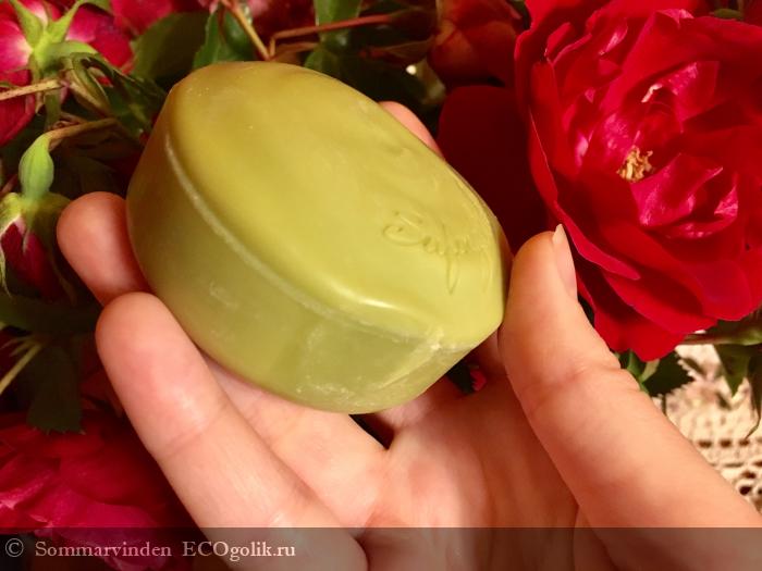 Толщина шайбы — около 2,5 см. Цвет у мыла фисташковый за счёт красителей, а вот аромат какой-то ванильно-непонятный. Вообще если орешки фисташковые понюхать, они же не пахнут тем, что обычно ассоциируется с фисташковым ароматизатором. А аромат этого мыла мне и фисташковый ароматизатор не напоминает: какие-то цветочки, ванилька, в целом приятно, но даже не знаю, фисташка ли это. Знаю, что урбеч из сырой фисташки пахнет немного шишкой или хвоей, но такого тут замечено не было.