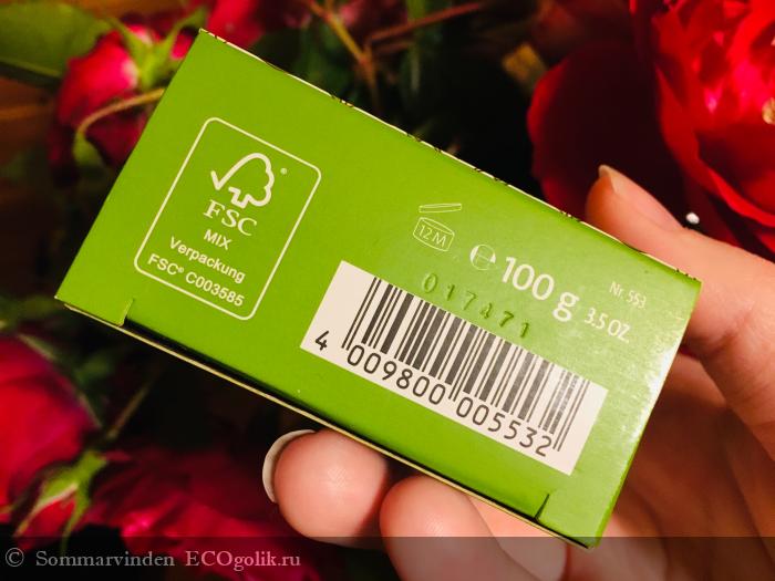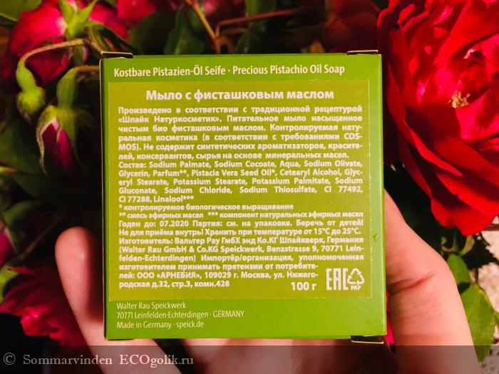 По традиции покрутим коробочку со всех сторон. Состав нормальный, всё сертифицировано, чисто-пушисто, синтетики нет. Меня масло фисташки очень привлекло, ожидала, что мыло будет вкусно пахнуть, ну или на крайний случай, бережно очищать. В этом кусочке всего 100 граммов, то есть шайба в два раза меньше кругляшей из классической линейки.