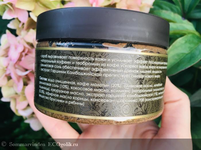 Вода очищенная; кофе молотый (20%); оливковое масло; реликтовая соль (10%); кокосовое масло; ксилианс* (натуральный эмульгатор из пшеницы); кукурузное масло; экстракт гарцинии камбоджийской (1%); витамин PP (0,5%); эфирное масло корицы; органический консервант Шаро-микс 708* (Benzyl alcohol, Benzoic Acid, Sorbic Acid, Glycerin)*.