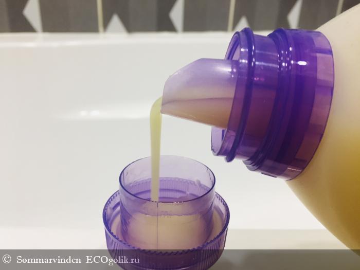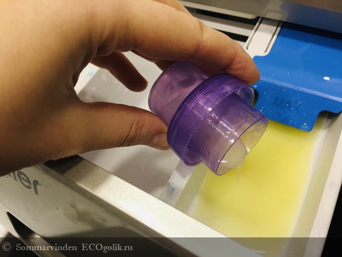 На стирку полагается наливать стаканчик из крышечки. Заявлено, что при таком расходе хватит кондиционера на 26 стирок в машине или 53 стирки вручную. Я стираю с кондеем только в машинке, кладу примерно 30 мл. По моим подсчётам использовала кондей точно больше 10 раз, в принципе как раз где-то чуть меньше половины упаковки у меня осталось.