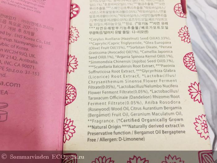 *Масло плодов лесного ореха, **Каприловый/Каприновый триглицерид, *Масло плодов Оливы Европейской, **Сорбитовый Оливат, *Масло авокадо, *Масло семян камелии японской, *Аргановое масло, *Масло симондисии китайской (жожоба), ***Экстракт корня шлемника байкальского, ***Экстракт корня пиона древовидного, ***Экстракт корня солодки голой, *Лактобактерии/Фильтрат закваски цветков хризантемы китайской, *Лактобактерии/Фильтрат закваски цветков лотоса орехоносного, *Лактобактерии/Фильтрат закваски корней одуванчика лекарственного, Древесное масло розового дерева, Масло плодов апельсин-бергамота, Масло пятнистой герани, **Отдушка.