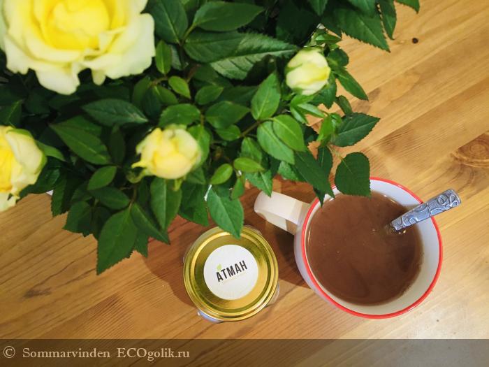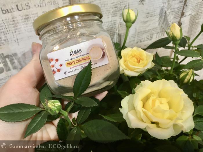 Я заядлый любитель горячих напитков и помимо традиционного чая и кофе частенько покупаю альтернативные напитки. У меня на кухне целый ящик забит травяными сборами, цикорием, сушёными ягодами, мате, матча, какао, овсяным и кокосовым молоком в порошке, сбитнями, сиропами и прочими вкусняшками. Когда я стала кормить ребёнка грудью, встал вопрос о том, что бы такого горячительного горяченького можно выпить вечером, чтобы и вкусно было, и напиток не содержал кофеина. Выбор пал на латте суперфуд от Атман. Это был первый продукт марки, с которым я познакомилась, и сейчас я уже купила вторую баночку.