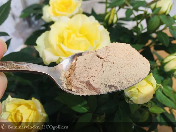 Порошок на вид коричневатый, достаточно мелкого помола, слегка сладковатый аромат напоминает что-то ореховое.