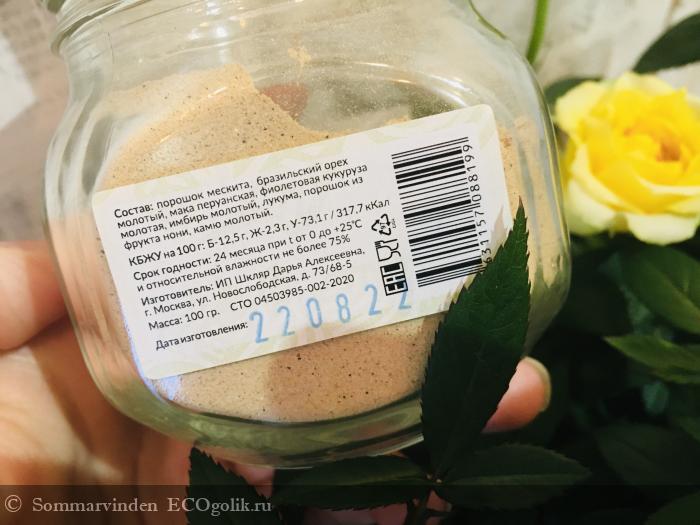 порошок мескита, бразильский орех молотый, мака перуанская, фиолетовая кукуруза молотая, имбирь молотый, лукума, порошок из фрукта нони, камю молотый.