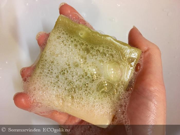 Мыло отлично пенится, пена лёгкая, обильная, руки не сушит. При намыливании запах почти не ощущается, но самое главное, что и нет аромата хозяйственного мыла, как, например, у мыла от Левраны. Мыло держит форму, не разваливается, не раскисает.