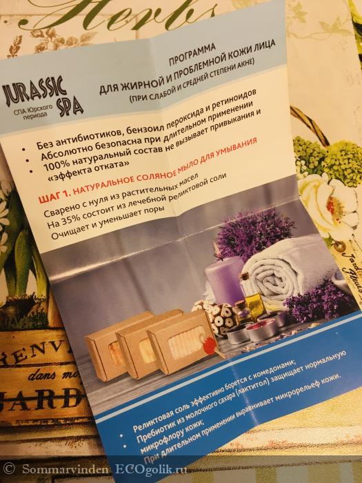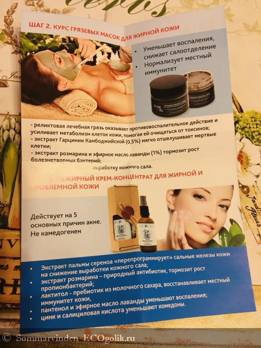 Под мылом была припрятана листовка с программой ухода для жирной и проблемной кожи. Честно говоря, я была удивлена тому, что кто-то ещё рекомендует мыть лицо мылом, каким бы нежным оно не было. Также не вижу проблемы в использовании (с назначения врача) антибиотиков, бензоил пероксида и ретиноидов. Всё-таки бывают формы акне, где одним налаживанием ухода не обойтись, но, конечно, этот вопрос лучше решать с профессионалами. Здесь же нам обещают и выравнивание микрорельефа, и пребиотики для микробиома кожи, наверное, это какое-то другое мыло для умывания, не конкретно это липовое для душа.