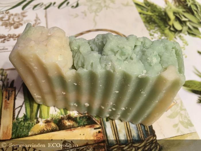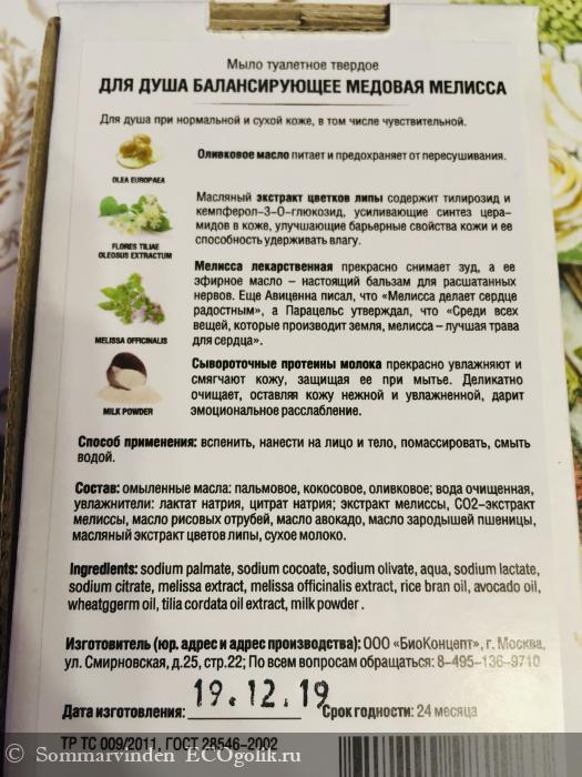 Мыло "Медовая мелисса" хоть в названии и не содержит упоминания липы, но взяла я его исключительно ради любимого аромата. Редко когда попадается мне косметика (кроме гидролата) с липовым экстрактом. У марки есть мыла на конопляном масле, но это мыло сварено на привычной смеси кокосового, оливкового и пальмового масел. Позиционируется как мыло для душа и в принципе в этой роли оно отлично работает, не раскисает, не размокает, сохраняет форму при использовании.