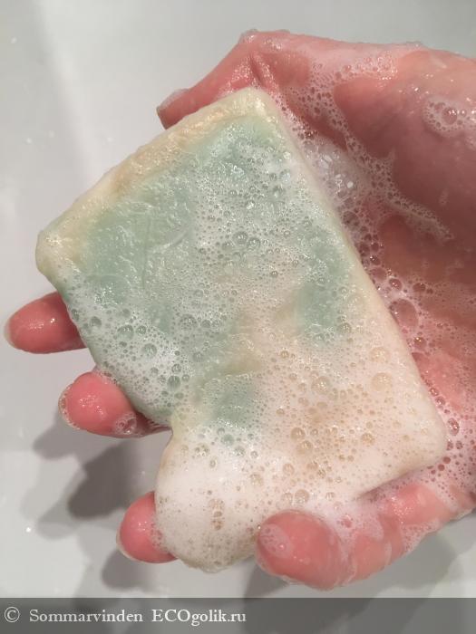 Я пользовалась этим мылом как мылом для душа, оно хорошо, хоть и неспешно мылится, источая аромат липы в процессе. Запах не навязчивый, на коже не остаётся. Мыло не сушит кожу, и на ощупь пена от него похожа на смесь классической мыльной пены и крема. За счёт увлажнителей и сухого молока мыло мягко удаляет загрязнения, не вызывая дискомфорта. Похожие ощущения были у меня от мыла Удумбары, то мыло тоже не сушит и не стягивает кожу.