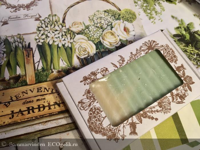 Внутри лежит кусочек мыла, обёрнутый в пластиковую плёнку. Тут, конечно, дело вкуса, я понимаю, что через открытое окошко мыло могли бы трогать пальцем в магазине или даже отковырять кусочек, но вместе с тем я была не против, если упаковка была бы закрытой, тогда и пластик бы не понадобился.
